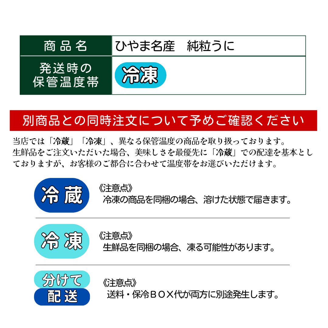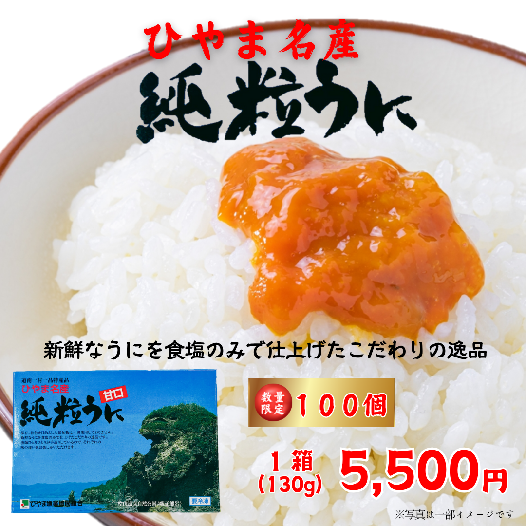 【限定商品】ひやま産 純粒うに 【限定商品】ひやま産 純粒うに(25-2)130g在庫状態 : 在庫有り ¥5,500(税込) 数量 【発送時保管温度帯:冷凍】新鮮なうにを食塩のみで仕上げたこだわりの逸品生産量が限られているため希少です!
