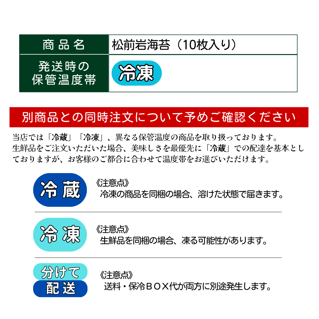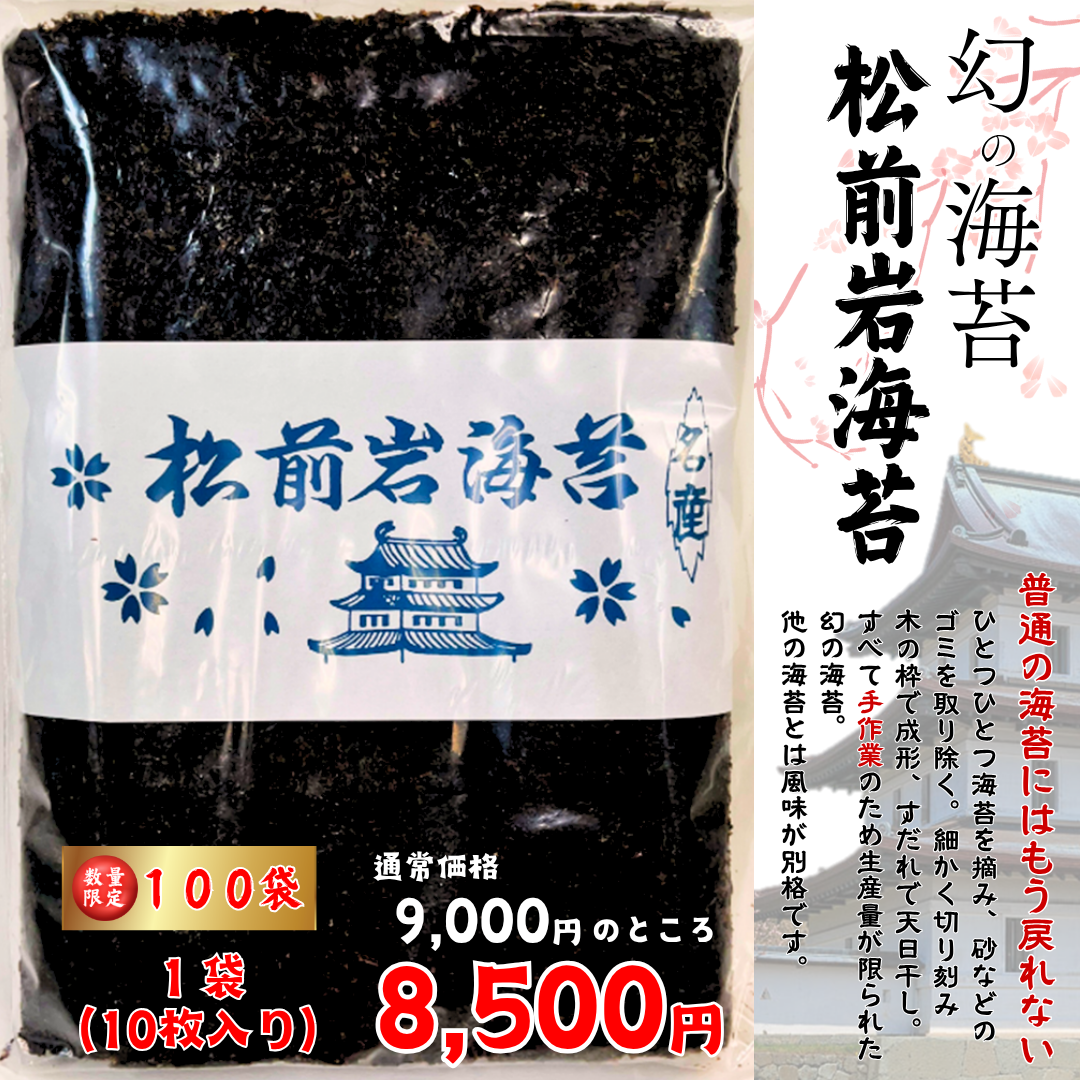 【限定商品】松前岩海苔 【限定商品】松前岩海苔(25-1)10枚入り在庫状態 : 在庫有り ¥9,000 ¥8,500(税込) 数量 【発送時保管温度帯:冷凍】限定100袋【2025年11月~ 数量に達し次第受付終了】普通の海苔にはもう戻れないひとつひとつ海苔を摘み、砂などのゴミを取り除く。細かく切り刻み木の枠で成形、すだれで天日干し。すべて手作業のため生産量が限られた幻の海苔。他の海苔とは風味が別格です。