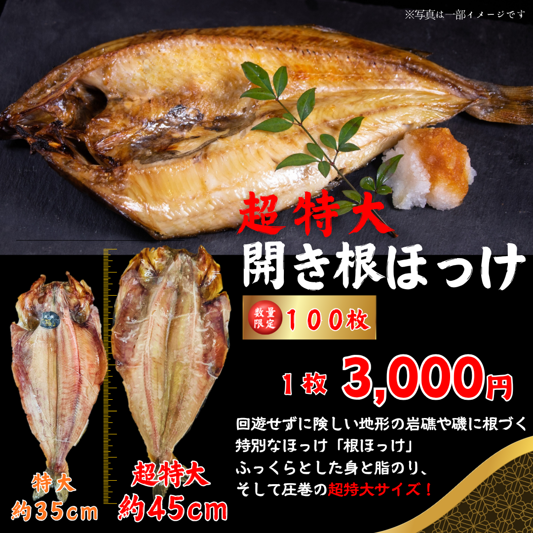 【限定商品】超特大 開き根ほっけ 【限定商品】超特大 開き根ほっけ(25-3)1枚在庫状態 : 在庫有り ¥3,000(税込) 数量 【発送時保管温度帯:冷凍】限定100枚【2025年11月~ 数量に達し次第受付終了】回遊せずに険しい地形の岩礁や磯に根づく特別なほっけ「根ほっけ」ふっくらとした身と脂のり、そして圧巻の超特大サイズ!